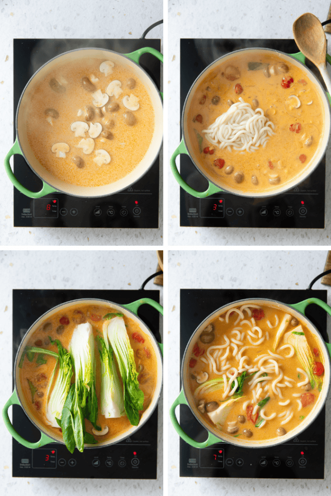 Hacke die Zwiebeln in Halbringe, viertle die Champignons und schneide Tomate und Pak Choi in mundgerechte Stücke. Füge das Gemüse der Brühe hinzu, ebenso wie die Udon Nudeln.