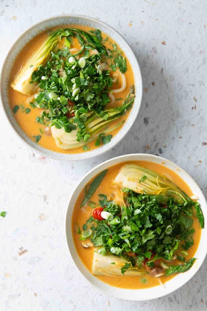 Koche die Suppe bis die Udon Nudeln gar sind und serviere sie dann mit gehacktem Koriandergrün und Frühlingszwiebeln.