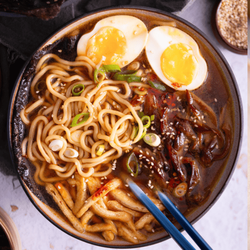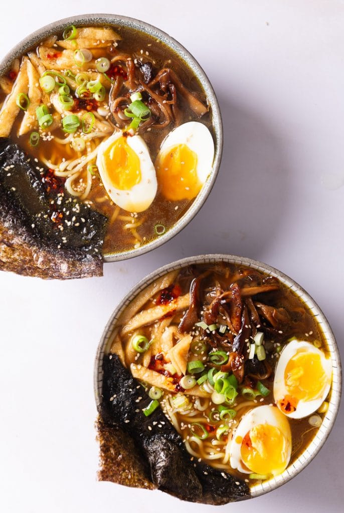 Shoyu Ramen vorbereiten:Shoyu Ramen solltest du wie auch Miso Ramen und Tantanmen Ramen frisch genießen. Jedoch lassen sich die einzelnen Komponenten der Shoyu Ramen hervorragend vorbereiten. Die Gemüsebrühe kannst du bis zu 3 Tage im Voraus zubereiten und auch die würzigen Pilze sowie die weich gekochten Eier lassen sich hervorragend vorbereiten.