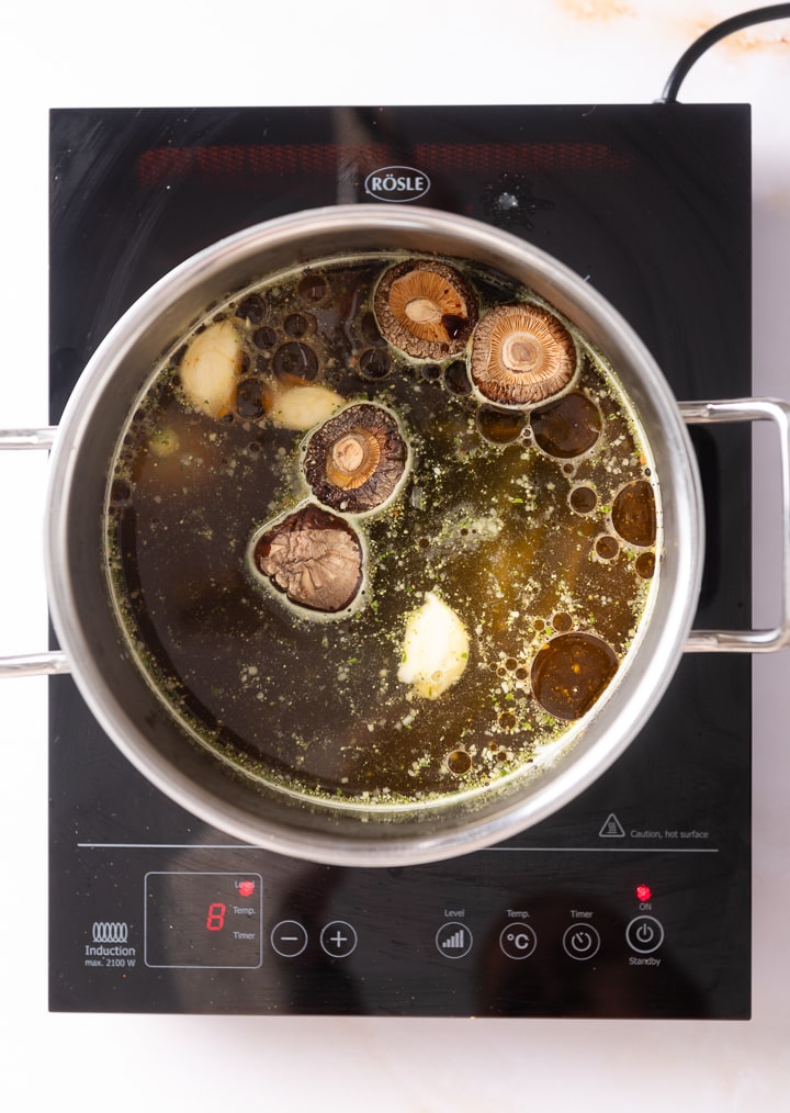 Gib die Gemüsebrühe in einen ausreichend großen Topf und füge das Sesamöl hinzu. Schäle Knoblauch und Ingwer und schneide beides in grobe Scheiben. Gib es zusammen mit Kombu und Shiitake mit zur Brühe. Füge nun Sake, Sojasoße und Zucker hinzu und lass die Brühe für mindestens 30 Minuten köcheln.