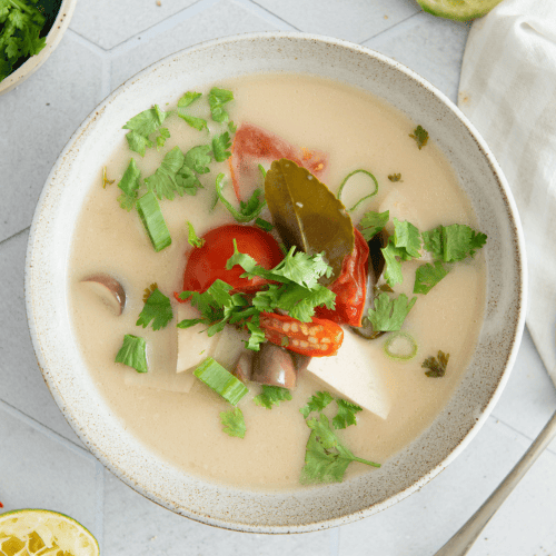 Anstelle von Tofu kannst du dieses Rezept auch mit Sojaschnetzeln oder veggie Hähnchenstreifen zubereiten.Etwas Reichhaltiger wird die thailändische Kokossuppe, wenn du kurz vor dem Servieren ein paar Glas- oder Reisnudeln mit zur Suppe gibst.