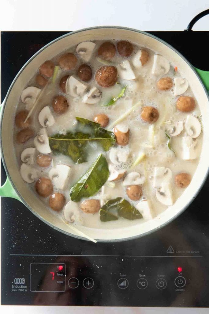 Erhitze die Kokosmilch zusammen mit der Brühe in einem Topf. Gib die Champignons, Galgant, Zitronengras, Chilis und Kaffir Limettenblätter dazu und lass die Mischung ca. 15 Minuten köcheln.