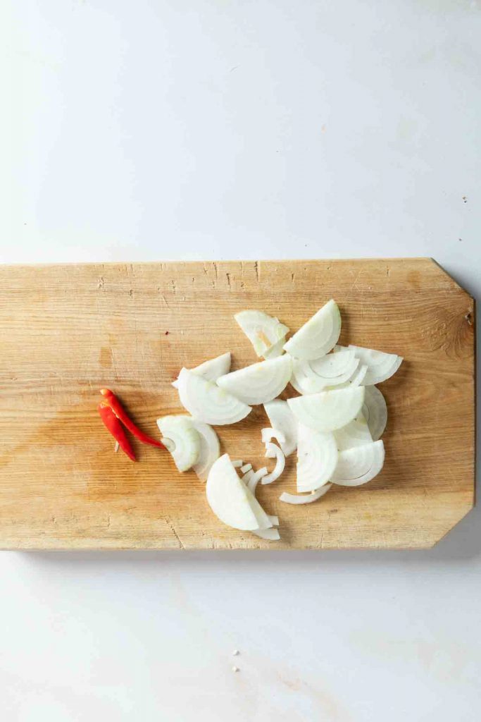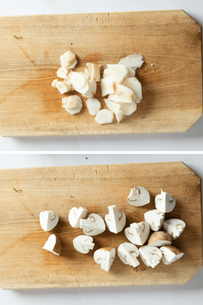 Putze die Champignons und schneide sie in Viertel. Schäle den Galgant und scheibe ihn in feine Scheiben. Drücke die Zitronengras-Stiele etwas an und halbiere sie längs. Halbiere die Chilischoten längs.Mein Tipp: Um Schärfe zu reduzieren, kannst du die Kerne und die helle Membran der Chilischoten in diesem Schritt entfernen.