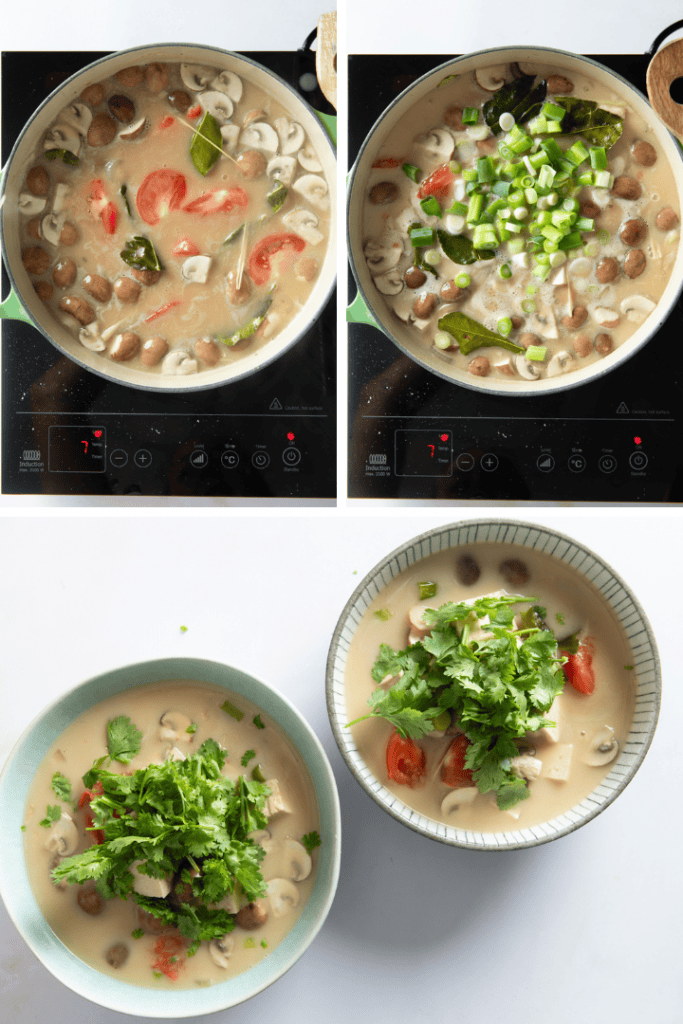 Gib Tofu, Zwiebeln und Frühlingszwiebeln mit zur Suppe und schmecke sie mit Fischsoße und Limettensaft ab. Serviere die Tom Kha Gai Suppe mit frisch gehacktem Koriander.