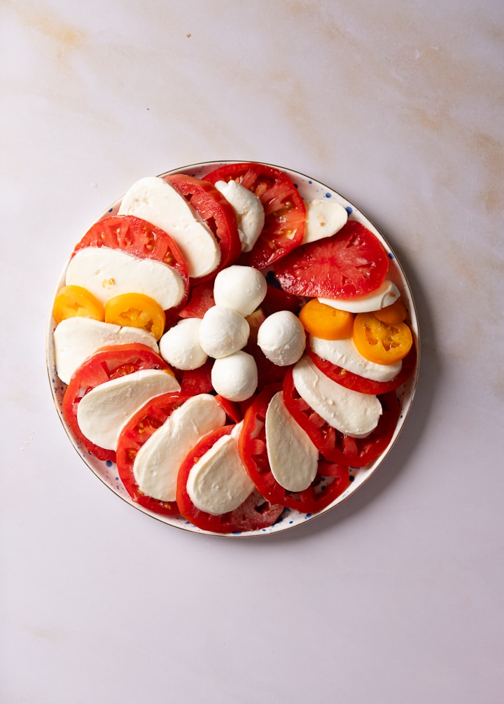 Lege dann Tomaten und Mozzarella abwechselnd auf einen Servierteller.