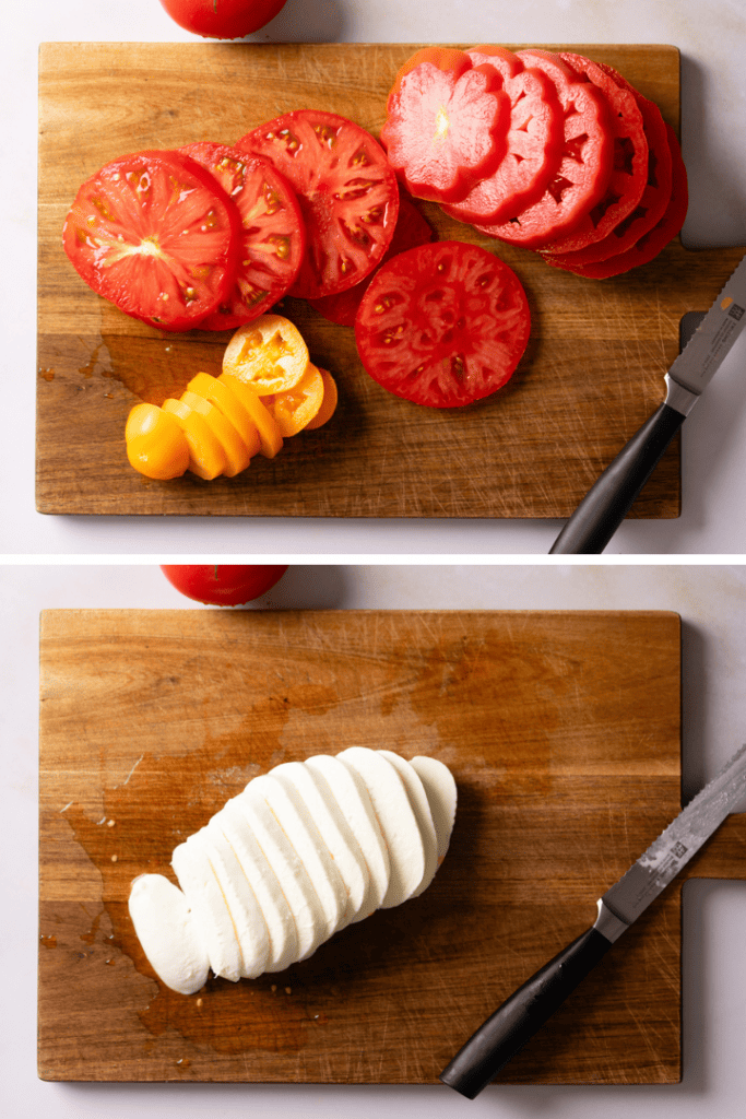 Schneide die Tomaten in etwa 5 mm dicke Scheiben und schneide den Mozzarella in gleich dicke Scheiben.