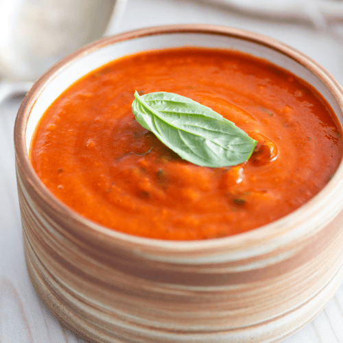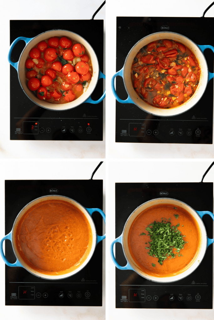 Koche die Tomatensoße 30-40 Minuten, bis die Tomaten weich sind. Püriere die Tomatensoße und schmecke sie mit Salz, Pfeffer und Zucker ab. Hacke den Basilikum und rühre ihn unter die Tomatensauce.