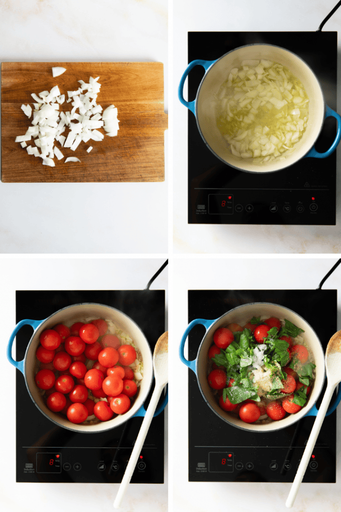 Hacke Zwiebeln und Knoblauch fein und brate sie in etwas Olivenöl an, bis sie glasig sind. Gib die Cherrytomaten hinzu sowie Zucker, Salz und Pfeffer.