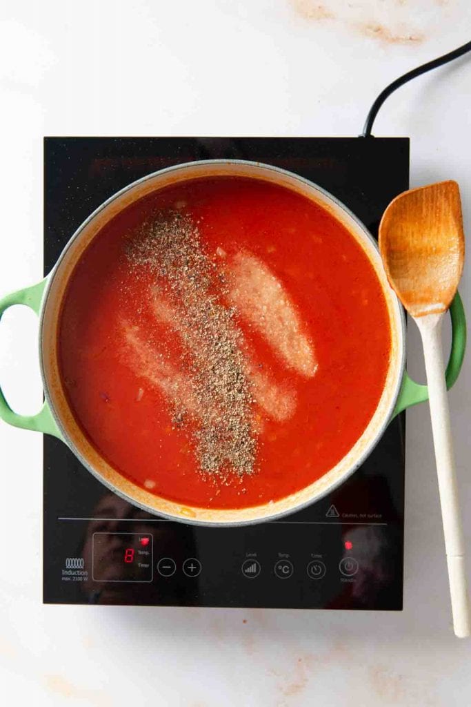 Lösche den Topf mit den passierten Tomaten ab. Gib etwas Wasser mit dazu, je nachdem wie flüssig deine passierten Tomaten sind. Bringe die Tomatensuppe zum köcheln. Würze sie mit Salz und Pfeffer.