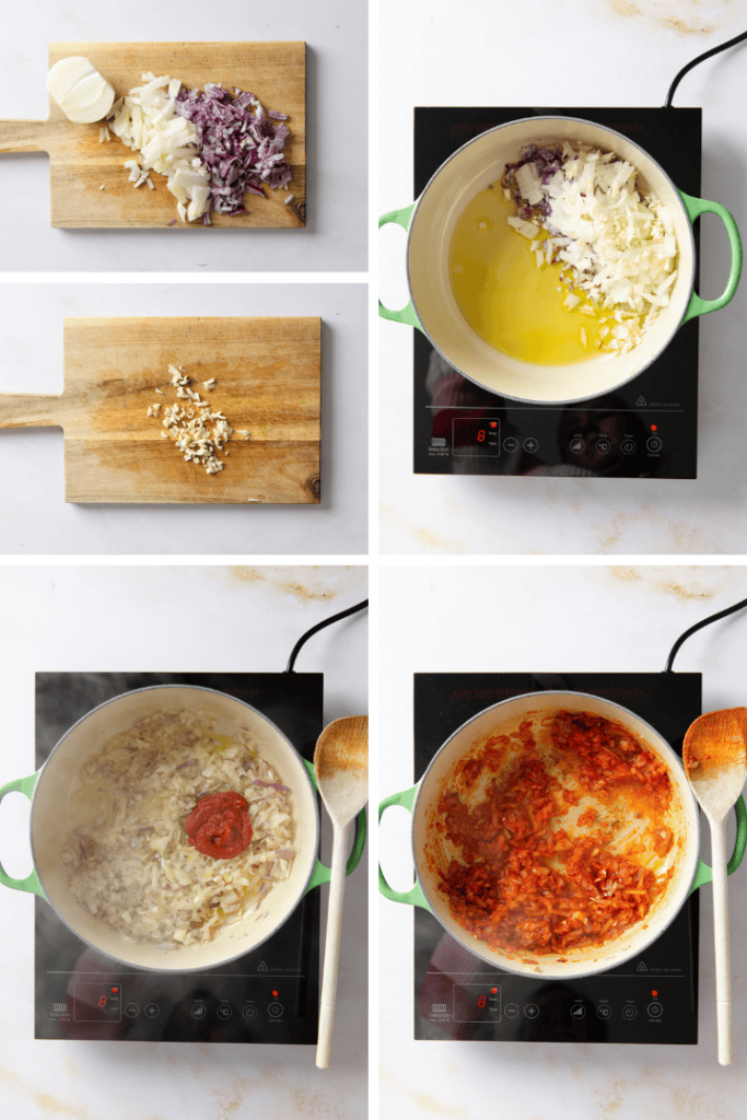 Hacke Zwiebeln und Knoblauch fein und brate beides in einem Topf mit dem Olivenöl an. Gib das Tomatenmark dazu und brate es kurz mit an.