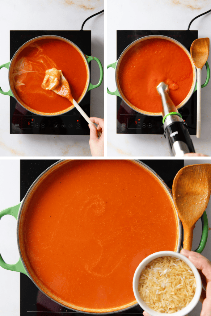 Füge die Creme Fraiche dazu. Püriere die Tomatensuppe und gib dann den Reis dazu.