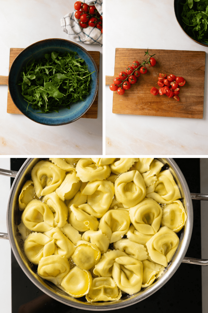 In einem großen Topf Wasser für die Tortellini zum kochen bringen. Derweil Rucola waschen und putzen, in eine Schüssel geben. Tomaten halbieren oder vierteln, in die Schüssel geben. Kapern dazu geben. Die Hälfte der Parmesansplitter und Pinienkerne mit dazu geben.
