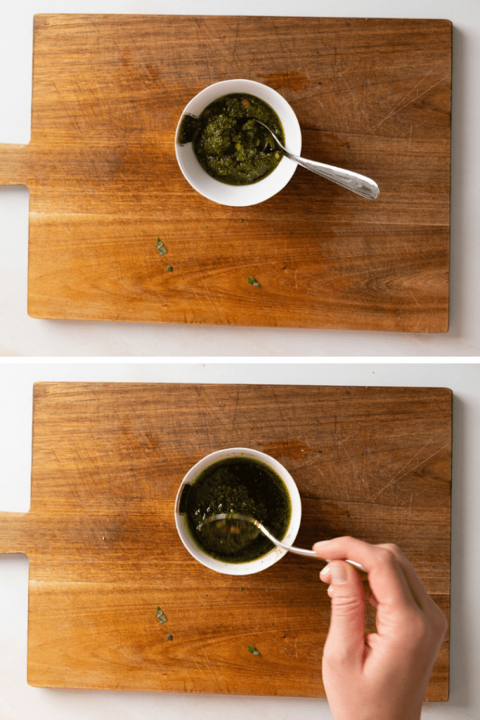 Für das Dressing Olivenöl, Balsamico und Pesto in einer Schüssel vermengen. Mit Salz und Pfeffer abschmecken.