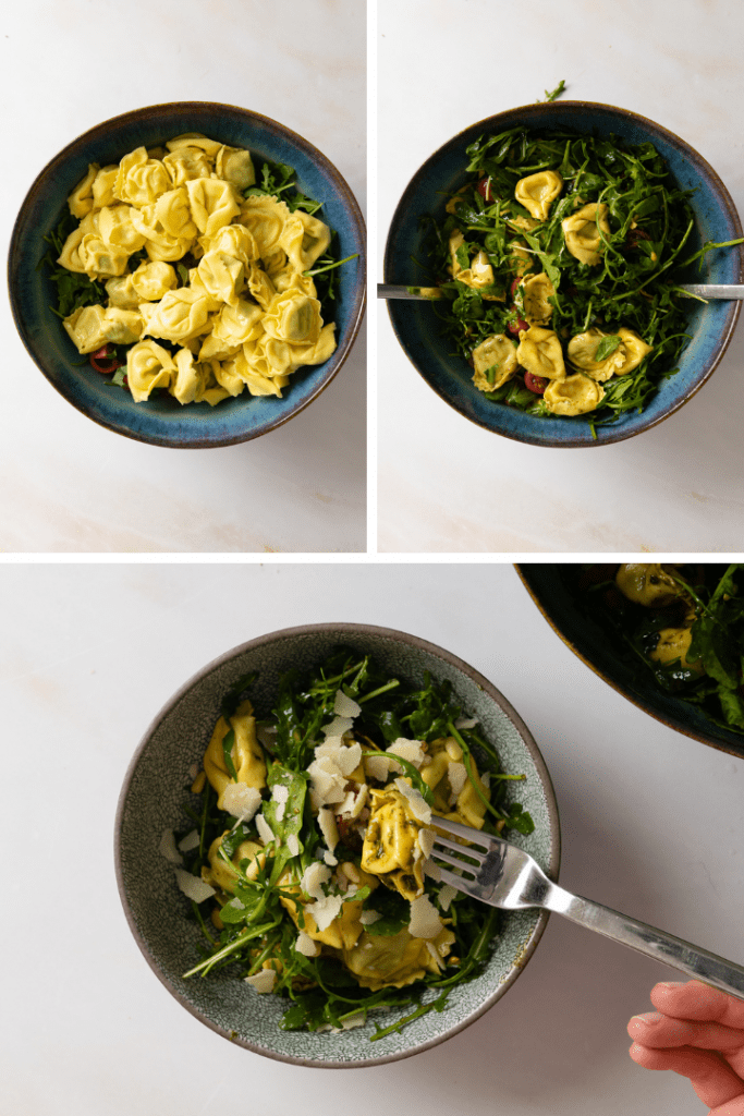 Tortellini nach Packungsangabe zubereiten. Abgießen und mit kaltem Wasser abschrecken. In die Salatschüssel geben. Mit Dressing übergießen, durchmischen und mit restlichen Pinienkernen und Parmesansplittern bestreuen und bis zum Servieren im Kühlschrank lagern.