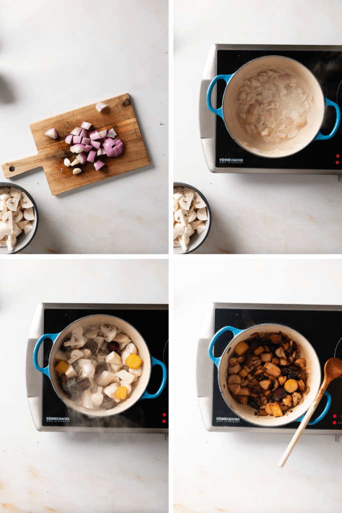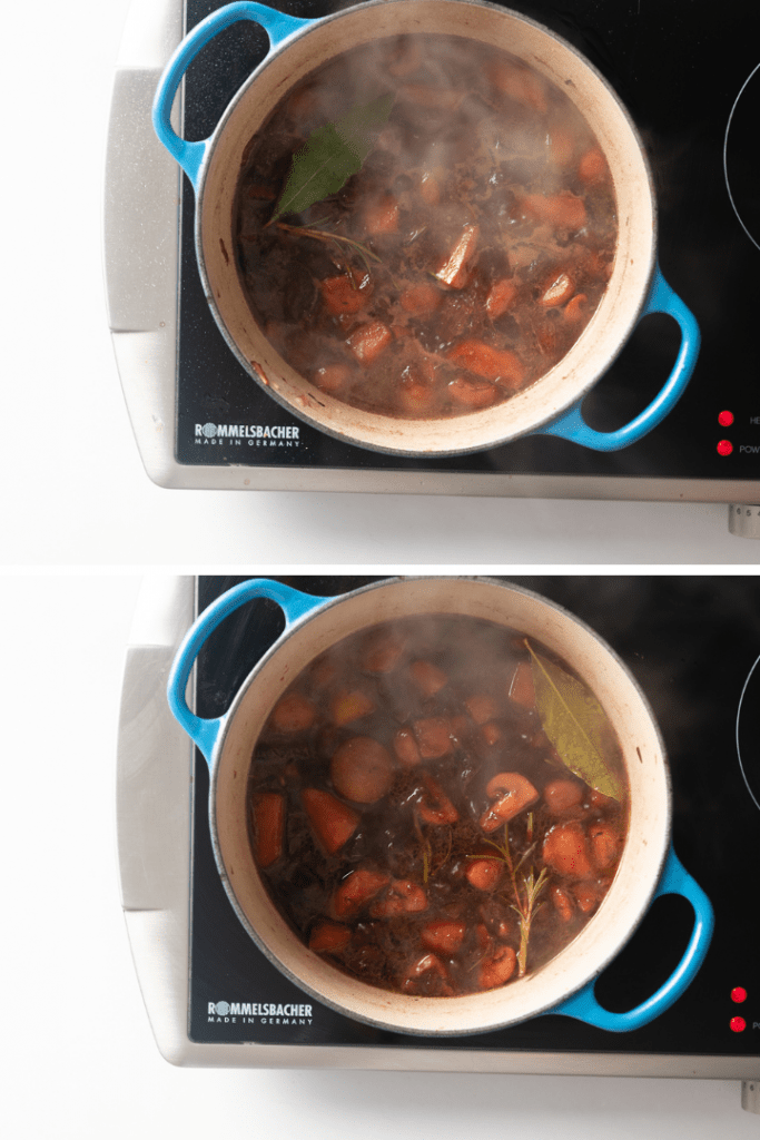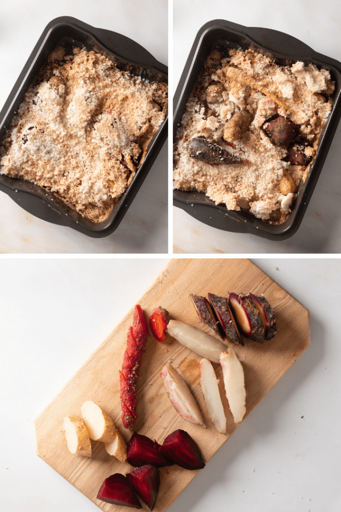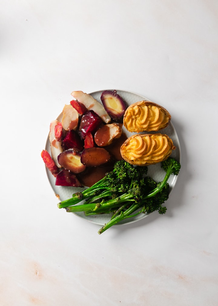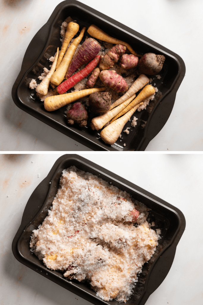 Wurzelgemüse aus der Salzkruste mit Rotweinsoße, gefüllten Kartoffeln und Wildbrokkoli