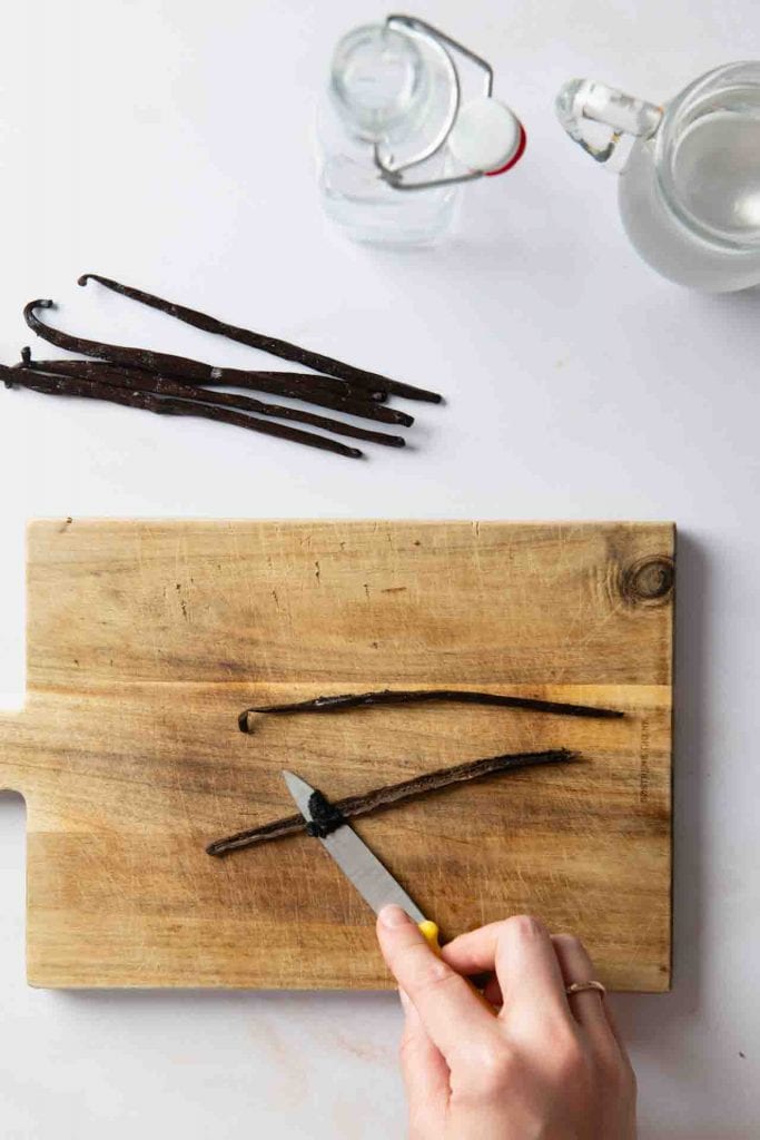 Halbiere die Vanilleschoten der Länge nach, kratze das Mark aus. Gib es in eine luftdicht schließende, sterile Flasche, ebenso wie die ausgekratzten Vanilleschoten. Fülle dann den Wodka auf und verschließe die Flasche.
