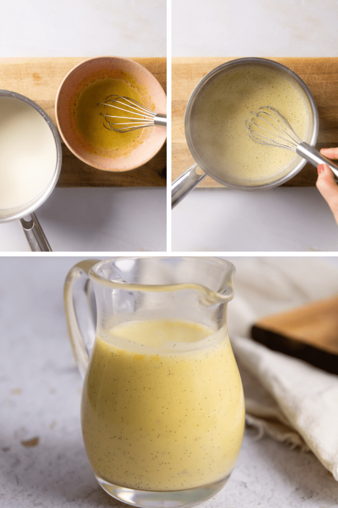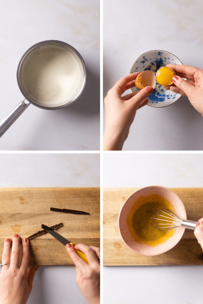 200 ml Milch und 50 ml Schlagsahne in einem Topf erwärmen. Derweil Eier trennen und das Mark von ½ Vanilleschote auskratzen. Das Vanillemarkt zusammen mit 2 EL Zucker, 2 Eigelb und 1 Prise Salz in einer Schüssel verrühren.