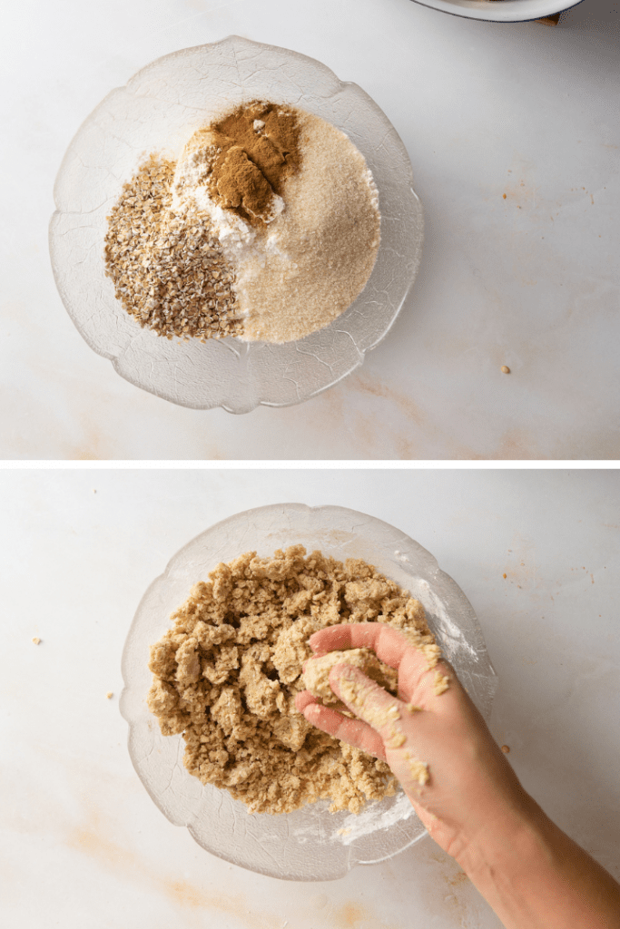 Backofen auf 170 °C Ober- und Unterhitze vorheizen. Für die Streusel Butter, Zucker, Mehl, Salz, Zimt und Haferflocken in eine Schüssel geben. Zutaten zwischen den Fingern zerreiben, bis die Masse die Konsistenz von nassem Sand hat.