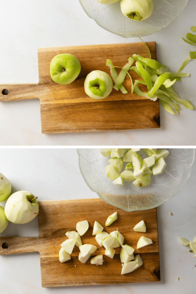 Äpfel waschen und ggf. schälen. Die Schale kann auch dran bleiben, das ist reine Geschmackssache. Die Äpfel dann vierteln, das Kerngehäuse entfernen und jedes Apfelviertel erneut vierteln.
