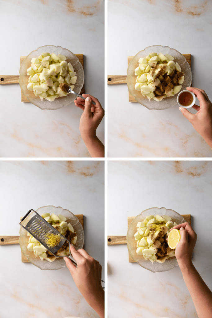Apfelstücke in eine große Schüssel geben. Mit Zucker, Vanilleextrakt, Zimt und Abrieb und Saft der Zitrone vermengen.
