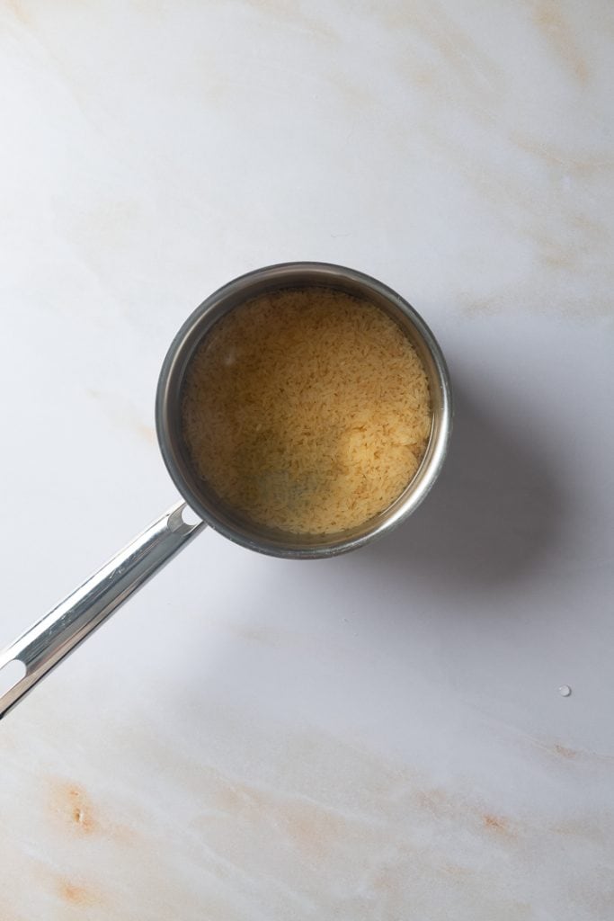 Reis zusammen mit 300 ml Wasser in einen passenden Topf geben und bei geschlossenem Deckel zum Kochen bringen, dann 20 Minuten bei geschlossenem Deckel kochen lassen.