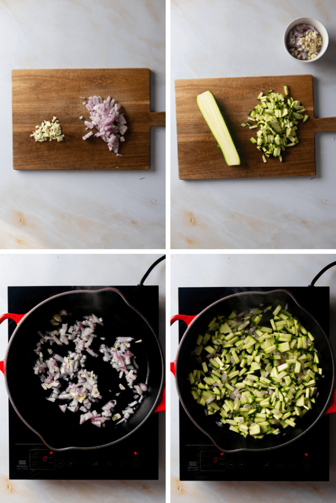 Derweil Zwiebel und Knoblauch fein hacken, Zucchini in etwa 1 cm große Würfel schneiden. In einer Pfanne etwas Pflanzenöl erwärmen. Zwiebeln und Knoblauch darin glasig anschwitzen, dann die Zucchiniwürfel dazugeben und anbraten.