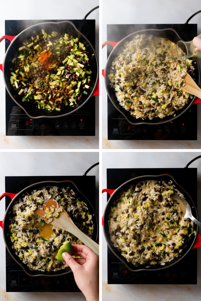 Die Bohnen abgießen und mit klarem Wasser abspülen, ebenfalls mit in die Pfanne geben. Den gekochten Reis hinzufügen und mit Kreuzkümmel, Koriander und Paprika würzen. Saft der Limette und Gemüsebrühe dazugeben und nach Bedarf mit Salz und Pfeffer würzen. Einige Minuten köcheln lassen, bis der Reis den größten Teil der Gemüsebrühe aufgesogen hat.