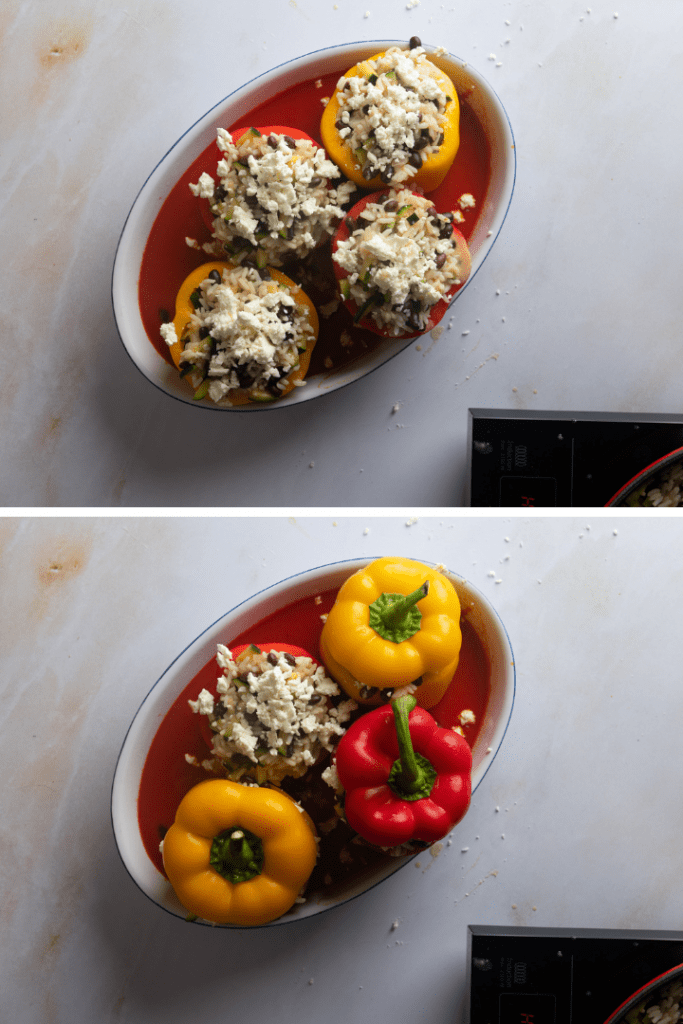 Füllung der Paprikaschoten mit ⅔ des Fetakäses versehen, unterrühren und dann die Füllung gleichmäßig auf die Paprikaschoten verteilen. Den restlichen Fetakäse auf die Paprikaschoten krümeln, dann den Deckel wieder draufsetzen.