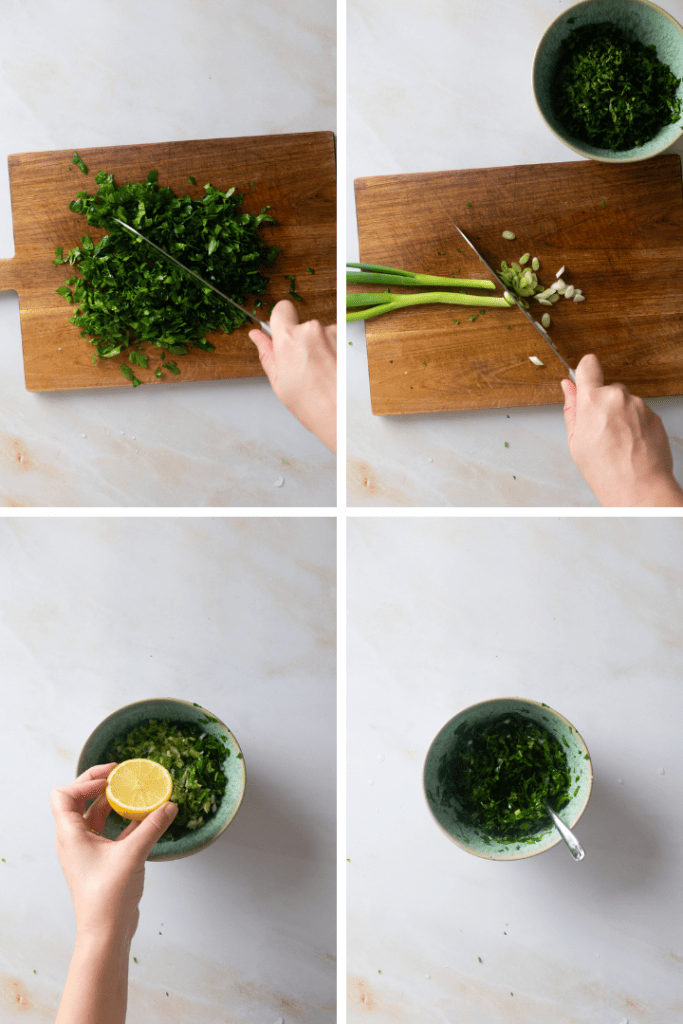 Während die Paprikaschoten garen, ist Zeit, den Petersiliensalat vorzubereiten. Dafür einfach Petersilie, Minze und Frühlingszwiebel fein hacken. In einer Schüssel mit Olivenöl und Zitronensaft vermengen. Mit Salz abschmecken.