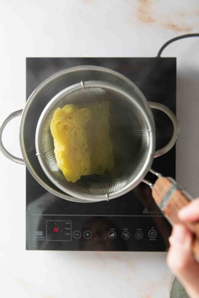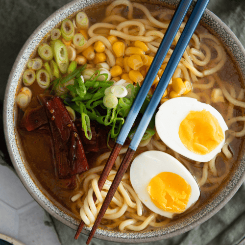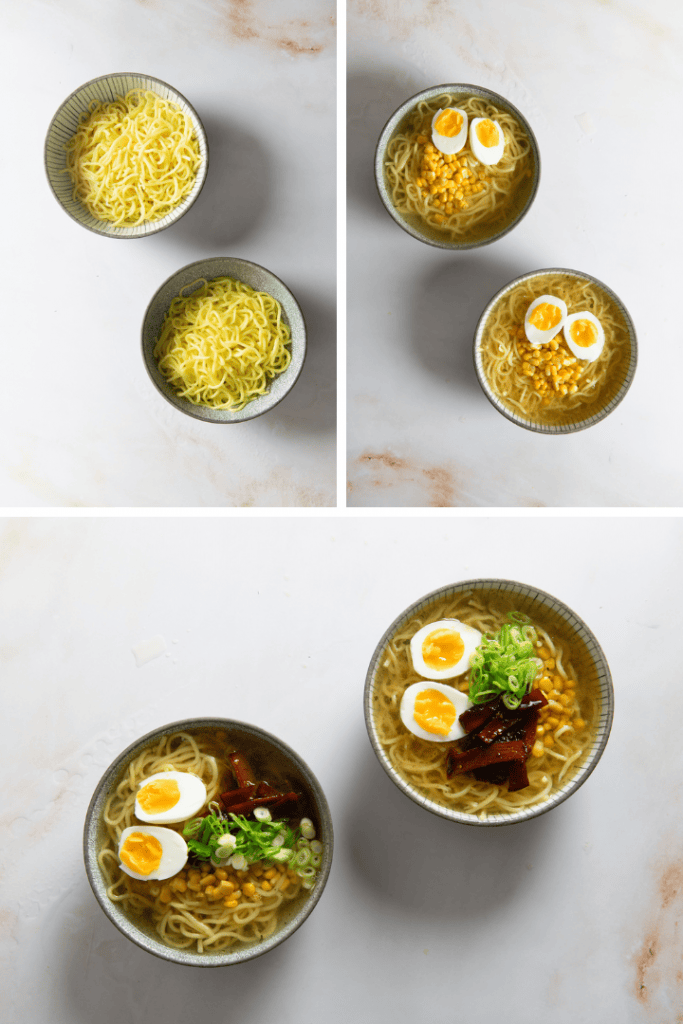 Koche die Eier für 7 Minuten, sodass sie wachsweich sind. Hacke die Frühlingszwiebeln sehr fein. Gieße den Dosenmais ab und koche die Ramen Nudeln nach Packungsangabe.