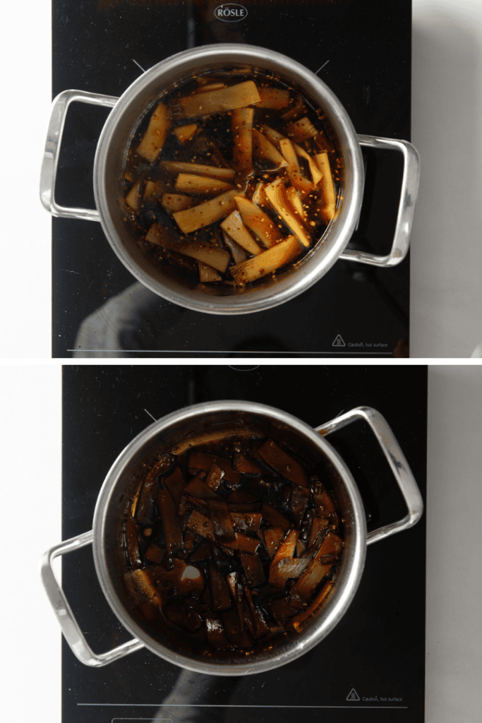 Gib derweil die Bambus-Scheiben samt der Flüssigkeit in der Dose in einen Topf und füge Sojasauce, Mirin, das Dashi-Pulver sowie Zucker und Chiliöl hinzu. Bringe die Bambusscheiben dann zum köcheln und lass sie unter gelegentlichem Rühren so lange kochen bis die Flüssigkeit zu einem Sirup verkocht ist.