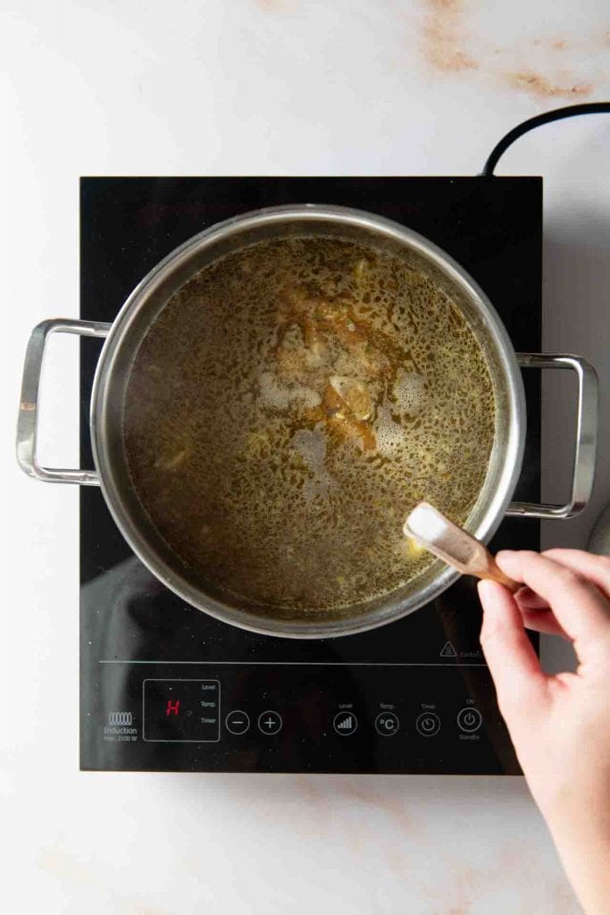 Gib das Wasser zusammen mit der Gemüsebrühe sowie den Knoblauchzehen und dem Ingwer und Sesamöl in einen Topf und lass die Mischung ca. 30 Minuten köcheln. Ingwer und Knoblauch musst du bloß vierteln. Schmecke die Suppe dann nach Bedarf mit Salz ab.