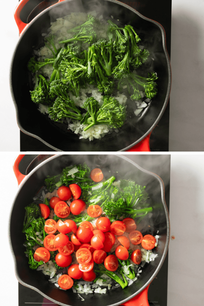 Erhitze das Öl in einer Pfanne und brate die Zwiebeln darin an, bis sie glasig werden. Füge Brokkoli und Tomaten hinzu.
