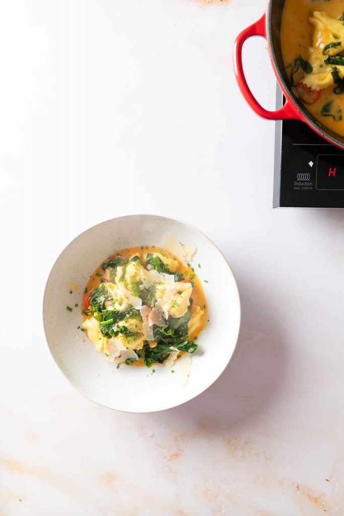 Gib Sahne und Wasser in die Pfanne und füge, sobald die Soße köchelt, die Tortellini hinzu. Lass die Tortellini ca. 5 Minuten garen. Gib dann den Spinat dazu und gare ihn kurz, bis er zusammengefallen ist.
