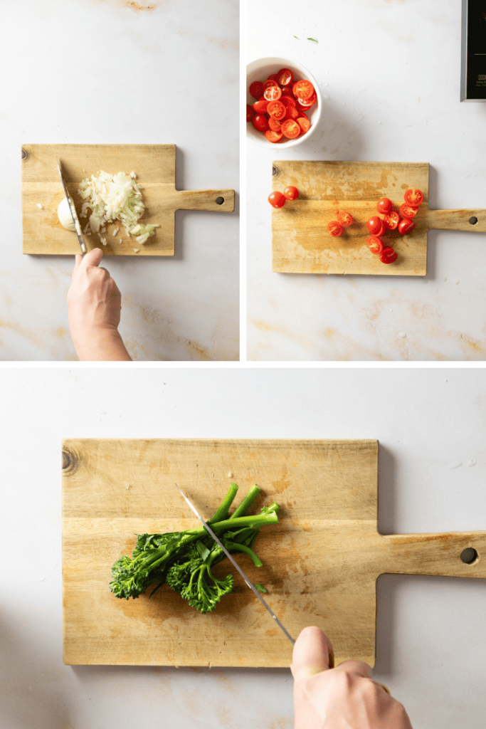 Hacke die Zwiebel fein. Entferne den Brokkoli vom Strunk und halbiere die Cocktailtomaten.