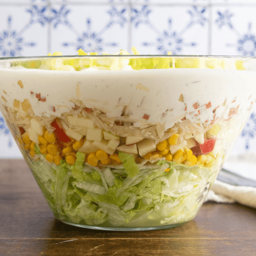 Der fertige Schichtsalat hält im Kühlschrank ohne Weiteres 2-3 Tage, auch wenn er bereits durchgerührt wurde.Serviere den Schichtsalat zum Grillen, zu frisch gebackenem Brot oder auf deiner nächsten Party auf dem Buffet.