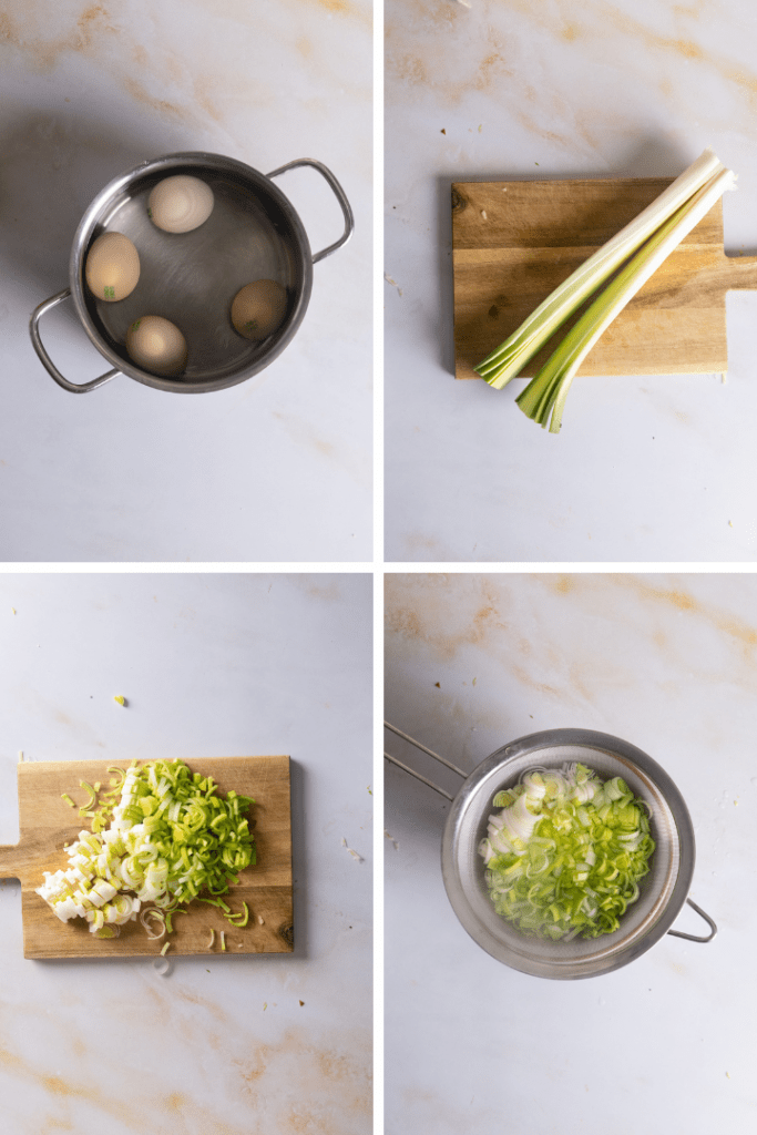 Zunächst die Eier in einen Topf mit kaltem Wasser geben, zum Kochen bringen und für 10 Minuten hart kochen. Dann abschrecken und kalt werden lassen. Den Lauch putzen und in feine Halbringe schneiden. Diese in ein feines Sieb geben und mit kochendem Wasser übergießen. 5 Minuten ziehen lassen, dann aus dem Wasser nehmen und abtropfen lassen.
