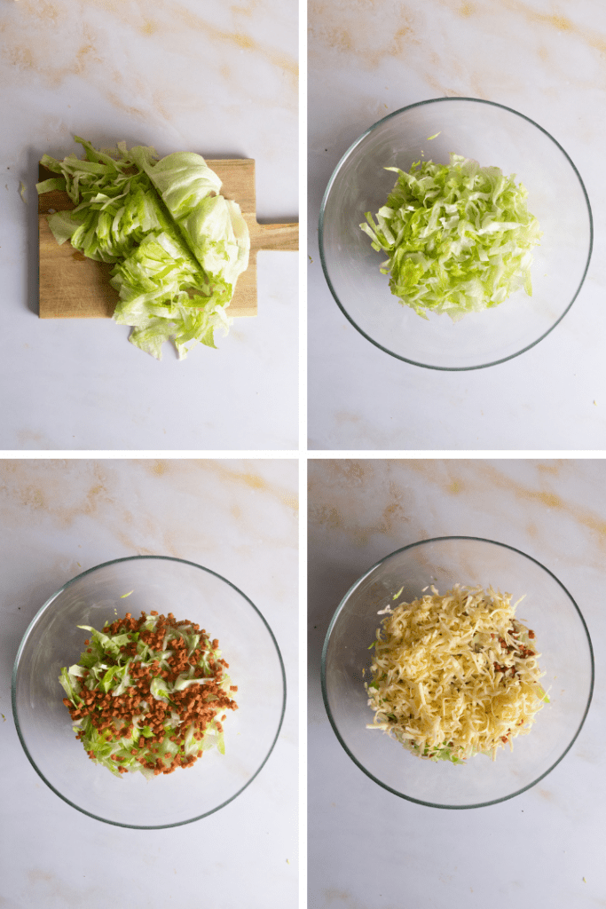 Eisbergsalat putzen und waschen und in etwa 5 mm dicke Streifen schneiden. In eine große Glasschüssel geben. Den veggie Bacon (wenn verwendet) auf den Salat geben, den Gouda reiben und in die Schüssel geben.