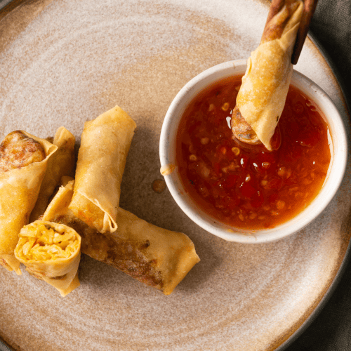Gib das Pflanzenöl in einen Topf und erwärme es auf 170 °C. Wenn du kein Küchenthermometer zur Hand hast, kannst du die Temperatur mit einem Holzkochlöffel prüfen. Steigen Blasen vom Stiel auf, wenn du ihn ins heiße Öl hältst ist die Temperatur ideal. Das Öl darf nicht rauchen. Gib nun die Frühlingsrollen ins heiße Öl und frittiere sie dort, bis sie goldbraun gebacken sind. Lass sie dann auf etwas Küchenrolle abtropfen und serviere sie mit Sweet-Chili-Soße