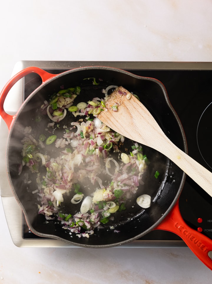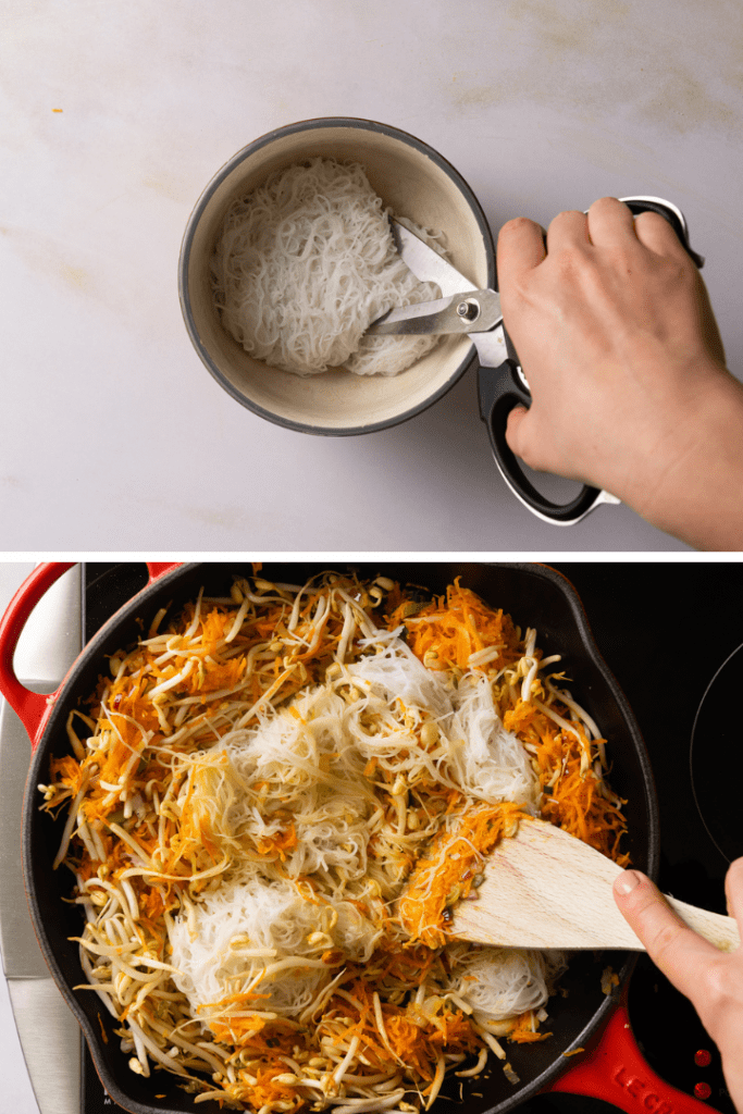 Reisnudeln nach Packungsangabe vorbereiten. Sie müssen je nach Sorte kurz gekocht werden oder einige Minuten in heißem Wasser ziehen. Derweil Knoblauch und Ingwer reiben. Zwiebel hacken und Frühlingszwiebel in sehr feine Ringe schneiden und die Karotten schälen und fein raspeln.