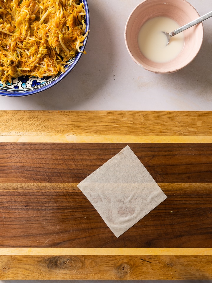 Die einzelnen Blätter des Frühlingsrollenteiges voneinander trennen und bereit legen. Vermenge in einer kleinen Schüssel die Speisestärke mit etwas kaltem Wasser. Diese Mischung brauchen wir um die Frühlingsrollen zusammen zu kleben.