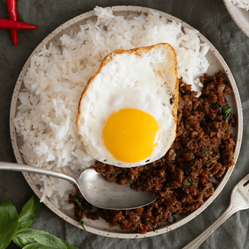 Serviere das Pad Kra Pao mit Reis und Spiegelei.