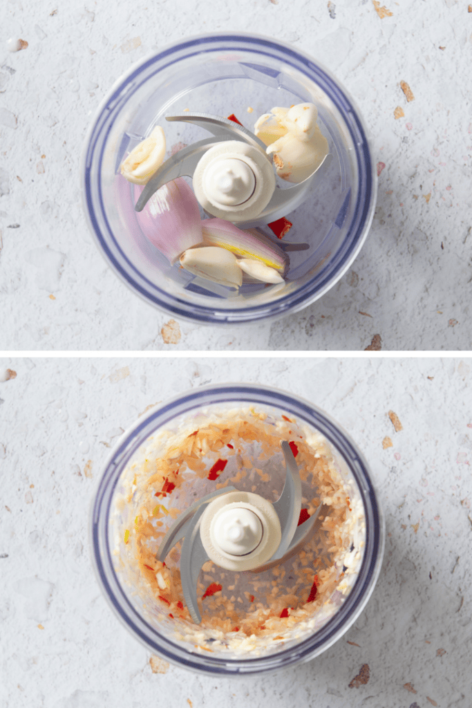Befreie die Thai-Chili vom Strunk und je nach gewünschtem Schärfegrad auch von den Kernen und Membranen. Schäle Knoblauchzehen und Schalotte und gib alles in einen kleinen Mixer oder Food Processor. Mixe die Zutaten kurz, bis sie eine feine Konsistenz haben. Alternativ kannst du Chili, Knoblauch und Schalotte auch sehr fein hacken.Mein Tipp: Mische die Stiele des Holy Basil mit, sie sind echte Aromabomben.