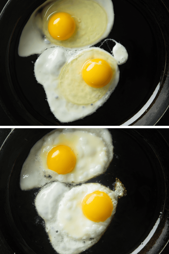 Kurz bevor der Reis fertig ist, beginnst du damit, die Spiegeleier zu braten. Nimm sie, sobald sie gar sind, aus der Pfanne und halte sie warm.