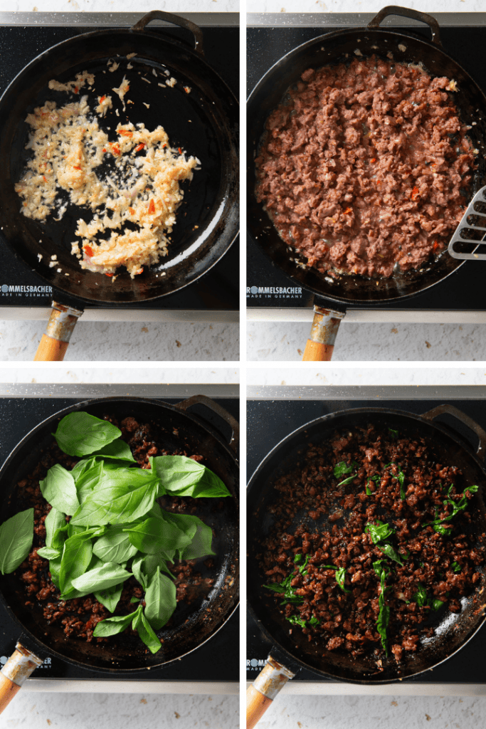 Brate die Mischung aus Chili, Knoblauch und Schalotte in etwas Öl scharf an. Gib dann das Hack dazu und brate es knusprig. Gieße dann die Soßenmischung darüber und füge die Basilikumblätter hinzu.