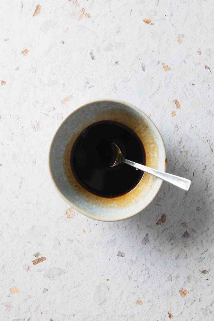 Vermenge in einer kleinen Schüssel Sojasauce, hell und dunkel, sowie Fischsauce, Austernsauce und Palmzucker.