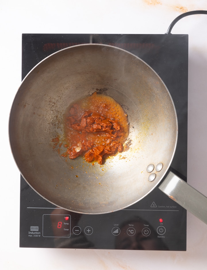 Erhitze das Kokosöl in einem Wok oder einer Pfanne. Gib die Currypaste dazu und lass sie unter beständigem Rühren warm werden. Die Paste entwickelt dadurch besonders viel Aroma.