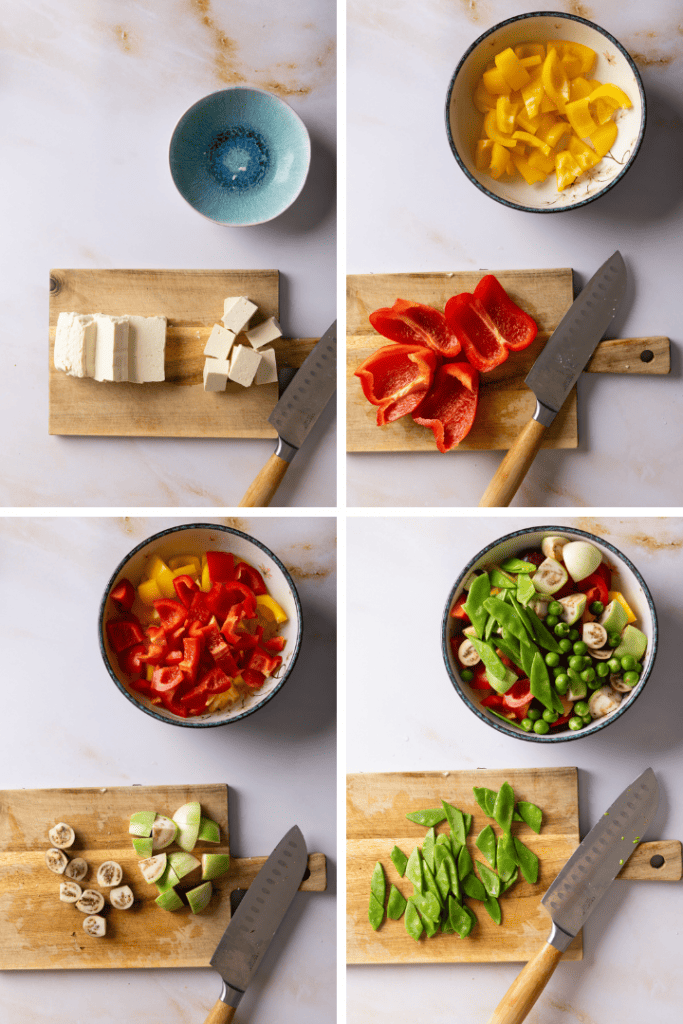 Schneide den Tofu in mundgerechte Würfel. Befreie die Paprika vom Kerngehäuse und schneide sie ebenfalls in mundgerechte Stücke. Halbiere die Zuckerschoten. Wer Thai Auberginen ergattern konnte, schneide sie ebenfalls in mundgerechte Stücke.