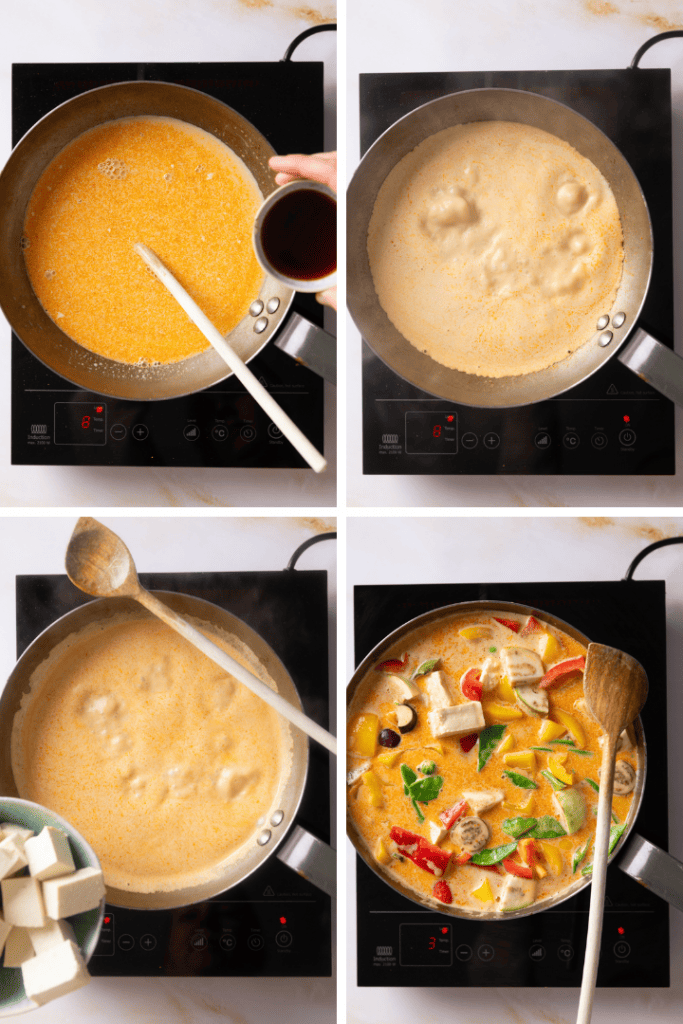 Lösche die Currypaste mit Kokosmilch und Wasser ab. Gib Die Kaffir Limettenblätter dazu und bringe die Mischung zum Kochen. Würze sie mit Fischsoße und füge das Gemüse und den Tofu hinzu. Lass das Curry für 10-15 Minuten köcheln.