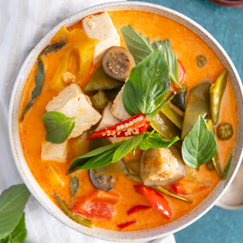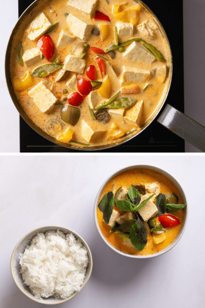 Leckeres Rezept für vegetarisches Thai Curry. Mit Gemüse, Tofu und cremiger Kokosmilch Soße ist dieses vegetarische rote Curry einfach unwiderstehlich lecker.